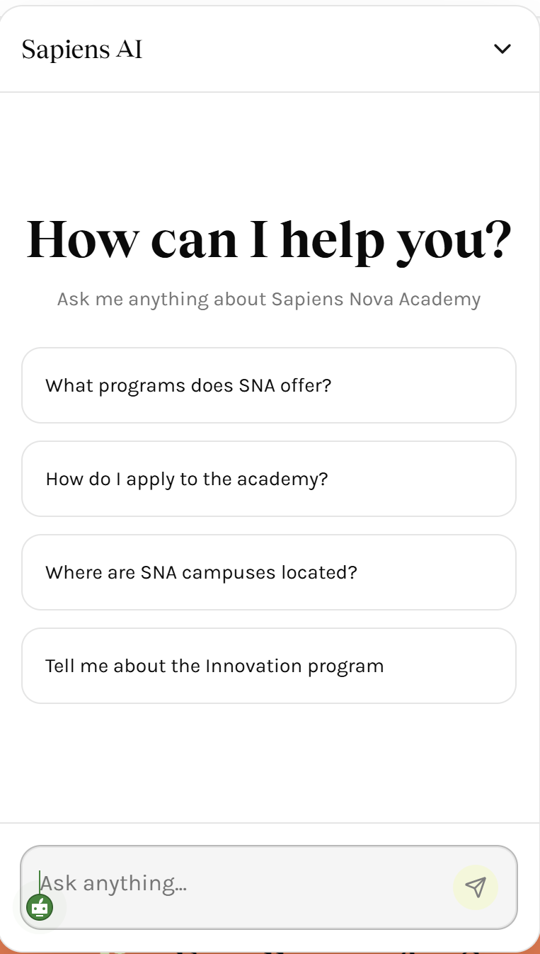 Sapiens Nova Academy is a global education and innovation platform designed to prepare students for careers in technology and entrepreneurship. Built with Next.js, TypeScript, Tailwind CSS, featuring a Retrieval-Augmented Generation (RAG) assistant powered by LangChain, integrated Stripe payment processing, and PostgreSQL database with pgvector for semantic search. The platform supports multi-programme education delivery, secure enrollment management, and real-time payment tracking.